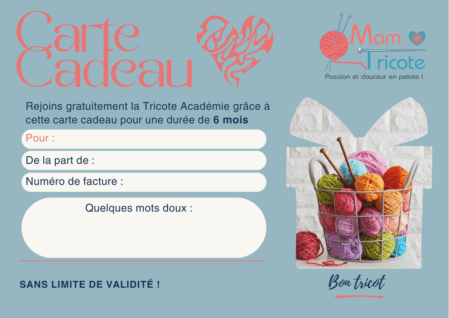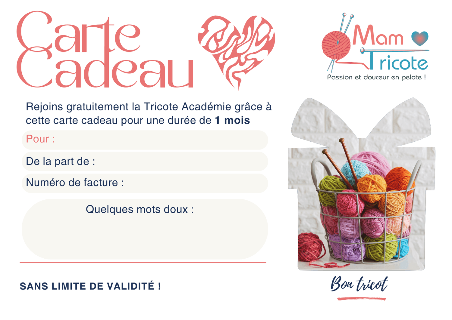 Choisi la durée d'abonnement à la Tricote Académie que tu souhaites offrir : 1 mois, 6 mois ou 1 an pour découvrir le plaisir de tricoter, dans une ambiance fun, accessible et conviviale.