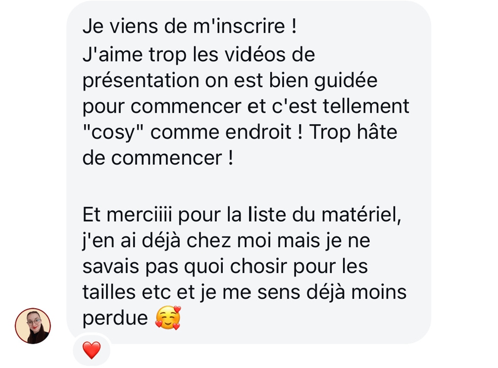 “Je suis contente du rythme que ça prend parce que dans nos vies active et de maman on a pas forcément beaucoup de temps et beaucoup de disponibilités mentale et franchement du coup c'est vraiment top.”