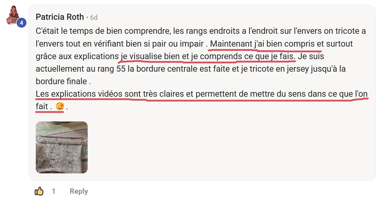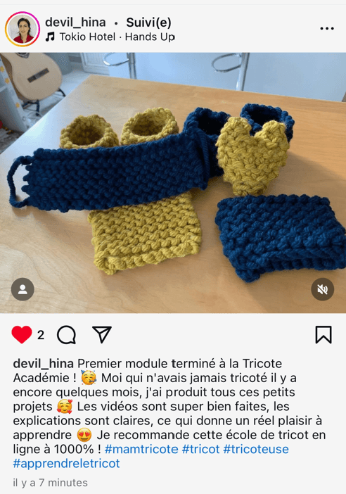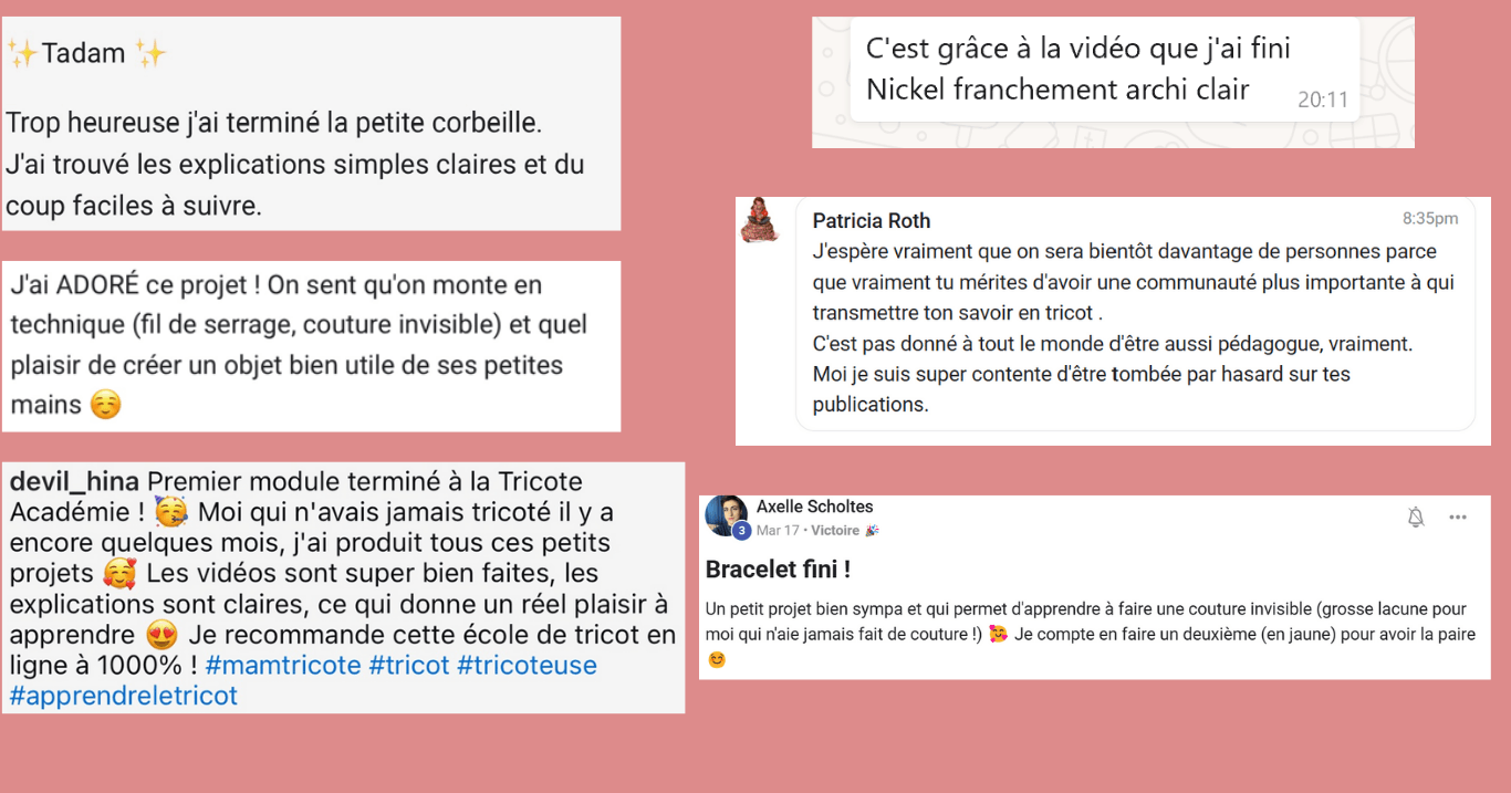 La Tricote Académie est conçue pour s’intégrer doucement et sans pression dans ton quotidien. Tu suis les modules à ton rythme, quand tu le peux. Parmi mes premières élèves, l’une savoure tranquillement le module 1, une autre avance à son rythme dans le module 2, et la troisième termine déjà le module 3.