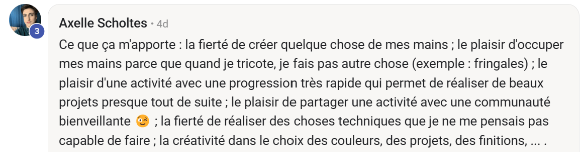 💬 Que ce soit en famille, entre amies ou en ligne, la communauté tricot est une vraie bulle de bienveillance.